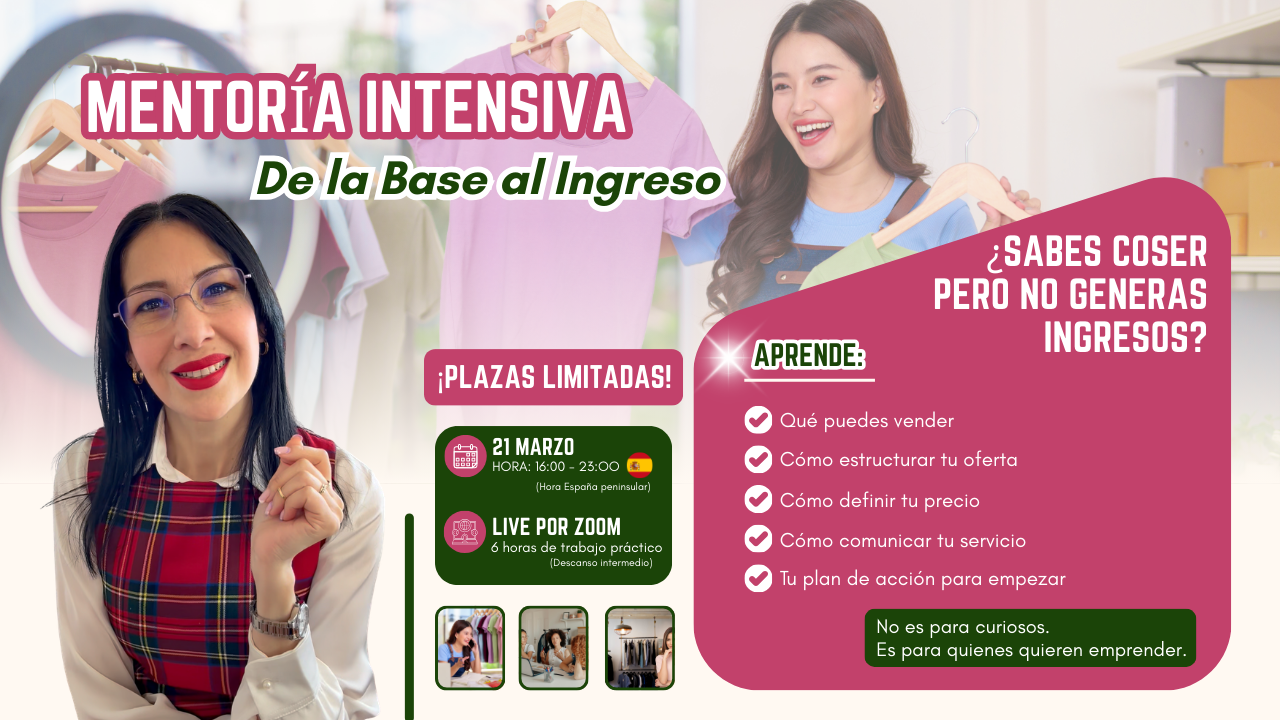Muchas personas aprenden costura, patronaje o confección. Saben hacer prendas. Saben usar la máquina. Tienen talento. Pero cuando llega el momento de convertir esa habilidad en ingresos, aparecen las dudas: • ¿Qué puedo vender realmente? • ¿Cuánto debería cobrar? • ¿Cómo consigo clientes? • ¿Cómo empiezo? Y el talento termina quedándose como hobby. El problema no es que te falte talento. El problema es que nadie te ha enseñado cómo estructurarlo como emprendimiento. Por eso he creado esta mentoría intensiva. Un espacio de trabajo práctico donde vamos a organizar tu talento y convertirlo en una base real para generar ingresos.